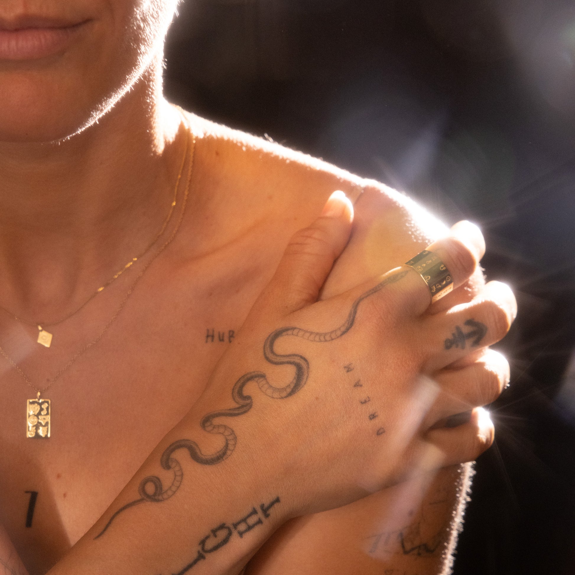 ⊹ Solid gold will never stain your skin and is unlikely to tarnish, though it is a soft metal and will scratch with wear. To us, scratches show the history of a well-loved piece, but if you want to preserve your piece be mindful of when and where you wear it.
