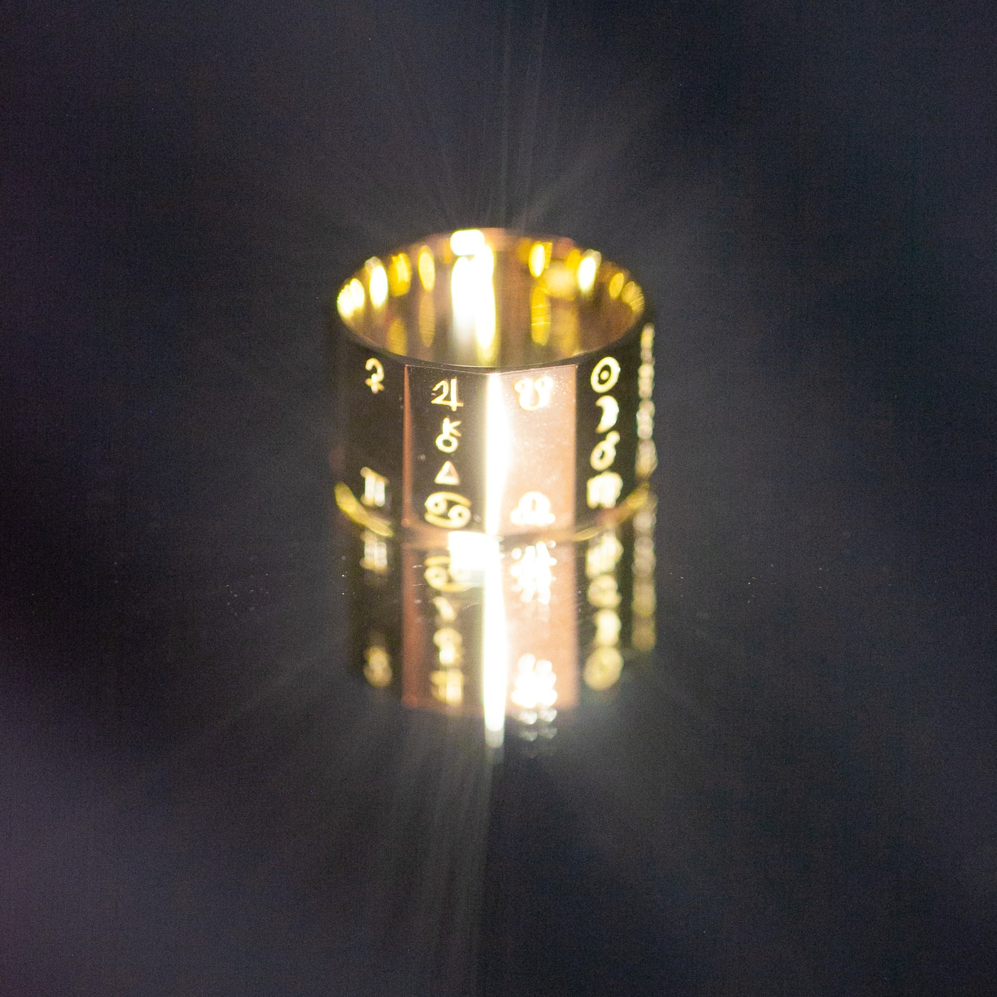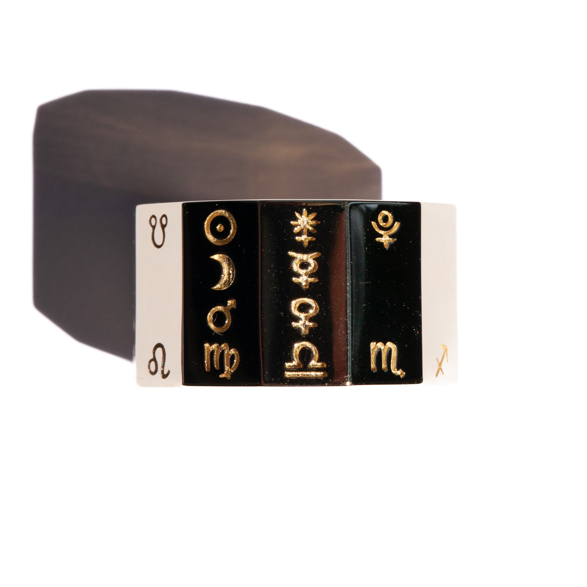 The ring is a 12mm tall, 1-2mm wide dodecagon shape that includes each house’s sign and up to six planetary placements or asteroids per house. The interior includes your initials, birth date, & time, so a record your energetic blueprint lasts for generations to come. Your great-great-grandchildren will always be able to look at this ring and connect with your energy.