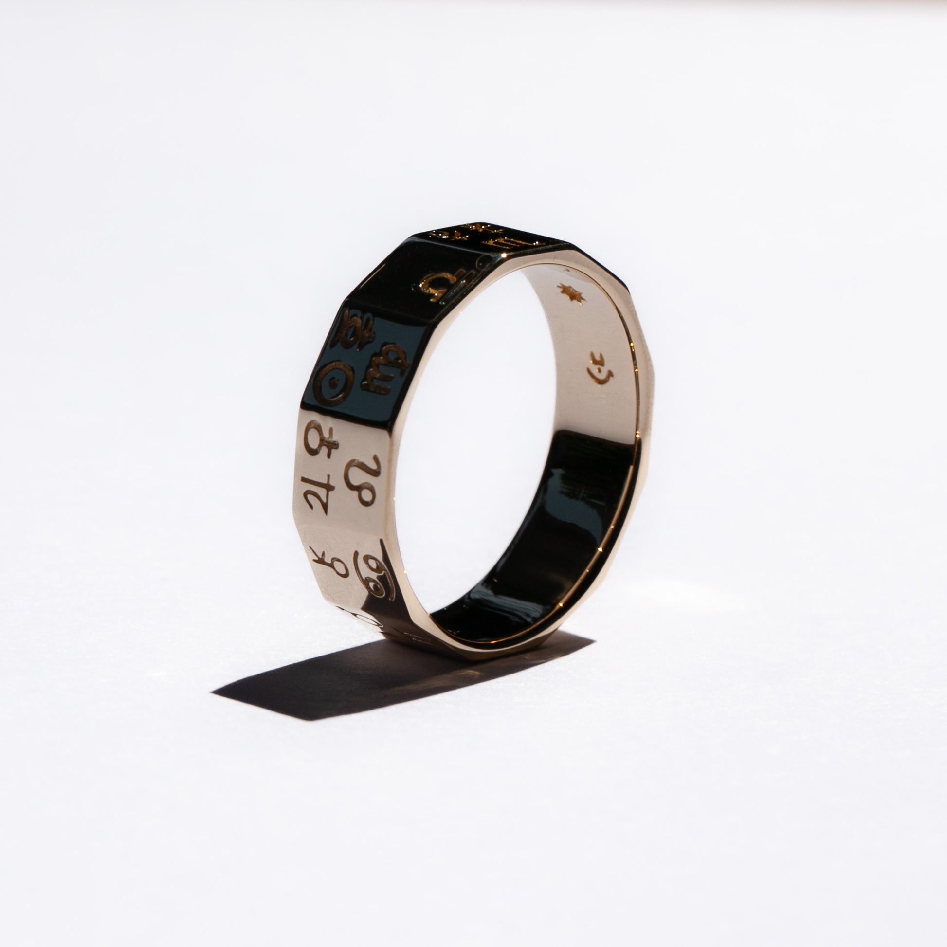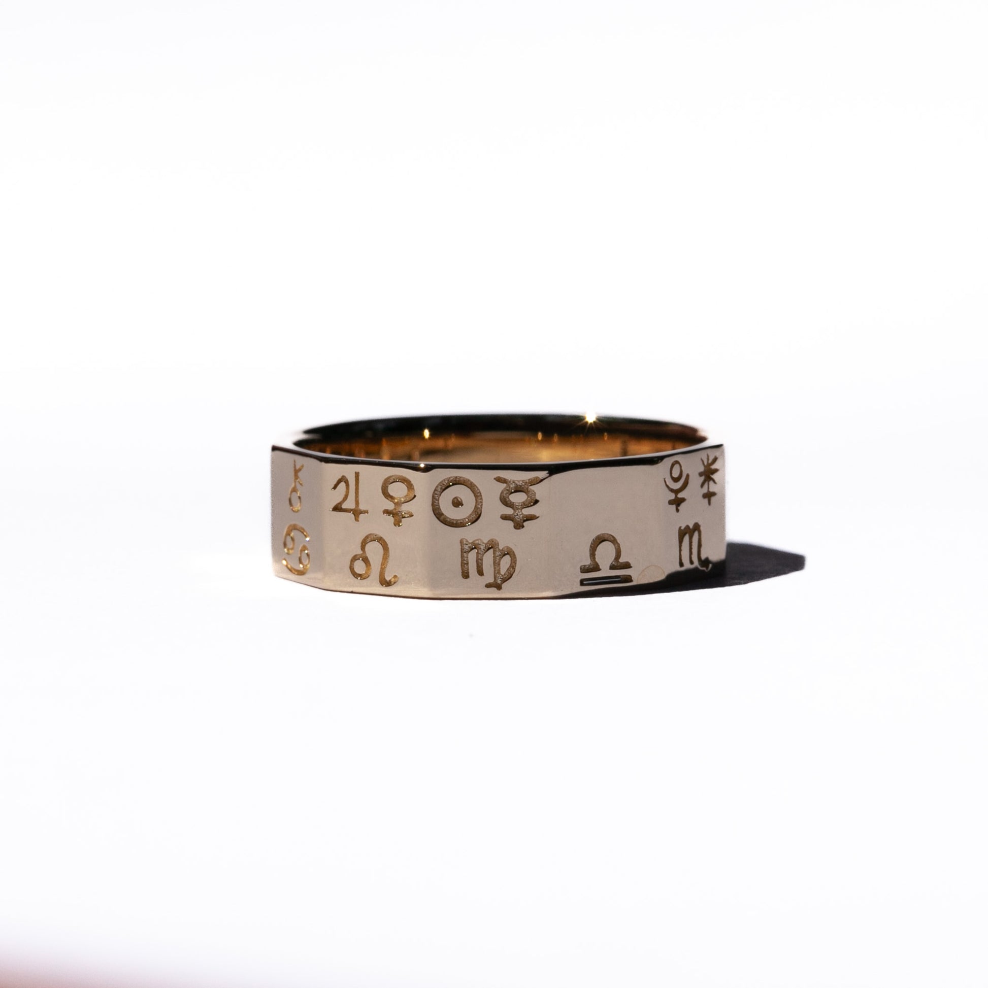 The ring is a 6mm tall, 1-2mm wide dodecagon shape that includes each house’s sign and up to two planetary placements or asteroids per house. The interior includes your initials, so a record your energetic blueprint lasts for generations to come.