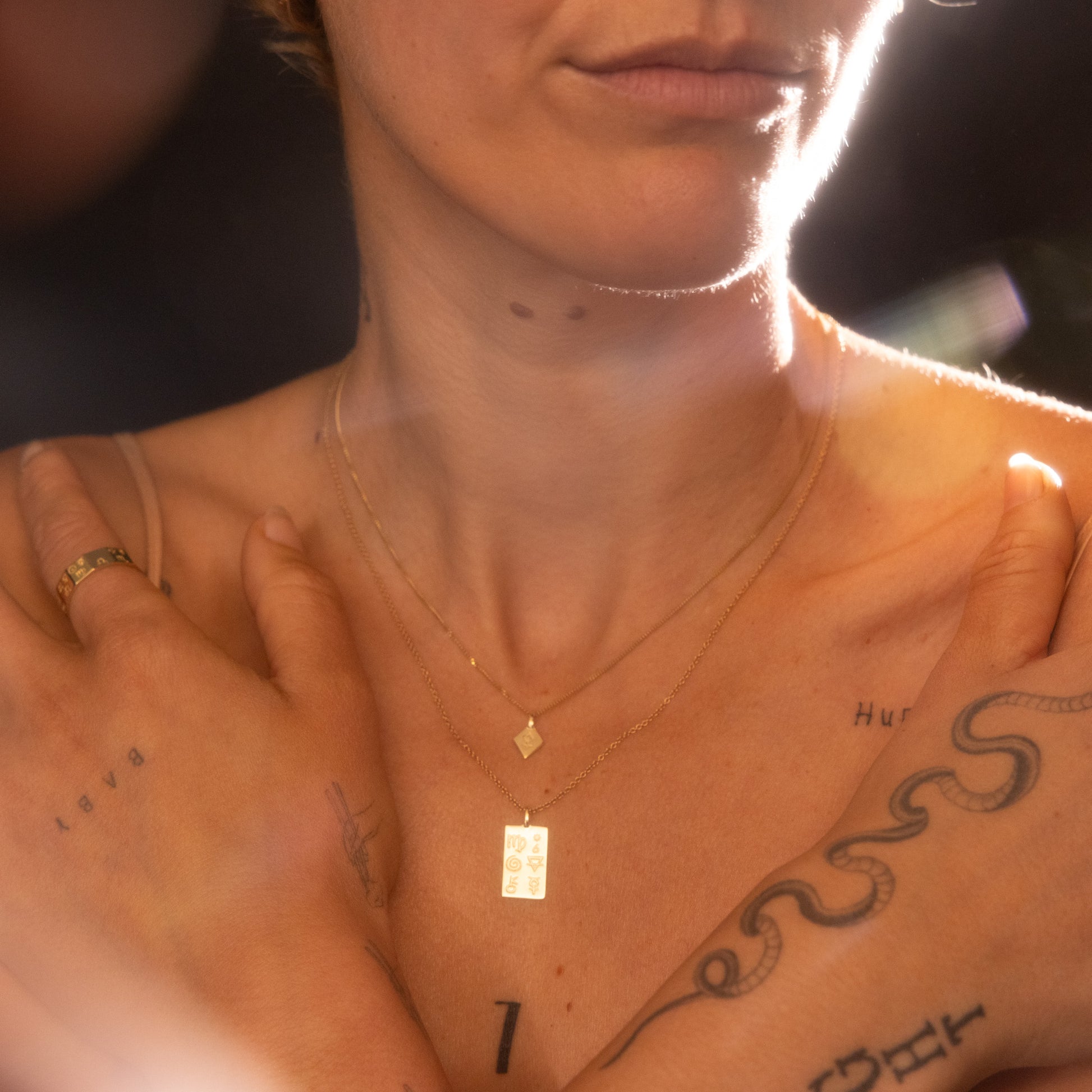 ⊹ Solid gold will never stain your skin and is unlikely to tarnish, though it is a soft metal and will scratch with wear. To us, scratches show the history of a well-loved piece, but if you want to preserve your piece be mindful of when and where you wear it.